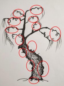 Trees often symbolize growth, wisdom, and resilience, and this illustration brings those ideas to life in an unexpected way. Instead of simply portraying a natural scene, the artist has intertwined human features within the organic form of the tree. The branches and leaves merge seamlessly into silhouettes of faces—some serene, some thoughtful, and others more expressive.