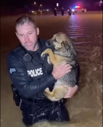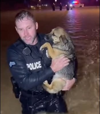 Despite the rising water and the weight in his arms, the officer pressed forward. He adjusted his footing carefully, moving inch by inch toward higher ground. The dog remained still, sensing safety in the steady rhythm of his heartbeat.