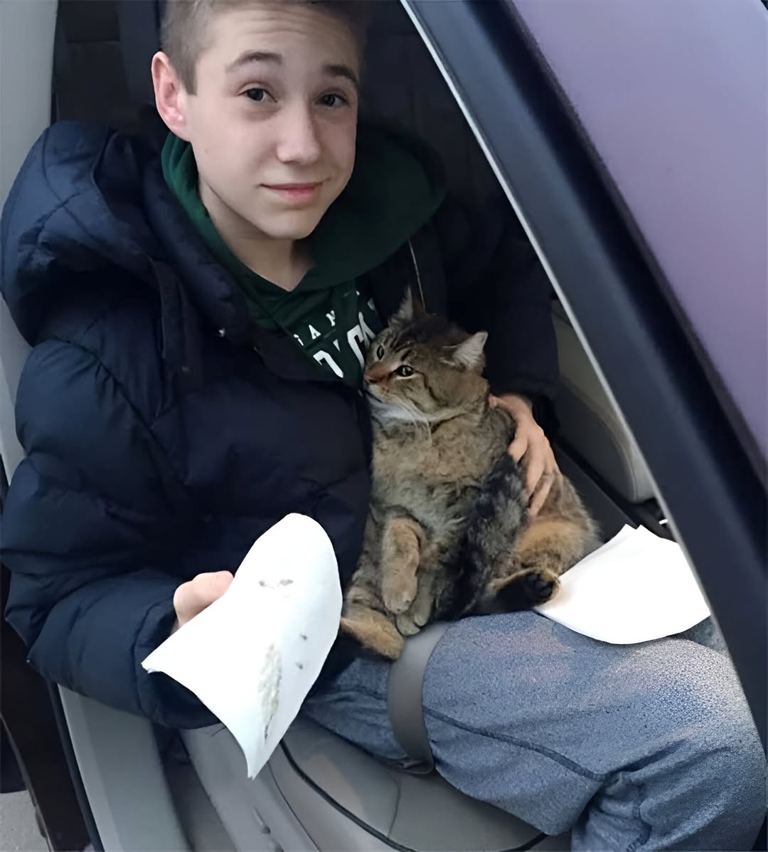 Wearing a thick black winter jacket over a green hoodie, the boy sat in the passenger seat of a car, holding the frightened feline gently against his chest. His face was calm, showing a mix of quiet pride and compassion. In one hand, he held a piece of paper towel stained — likely from drying off the cat or wiping away dirt and debris. A second towel rested on his lap beneath the cat, as if to say, “You’re safe now, and I’ve thought of everything.”