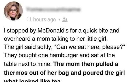 In that McDonald’s, amid the sounds of orders being called and trays clattering, a simple meal became a story of love and resilience. The mother’s thermos symbolized resourcefulness. The shared burger represented care. The Happy Meal, with its little toy, became a memory that little girl would probably treasure for a long time.