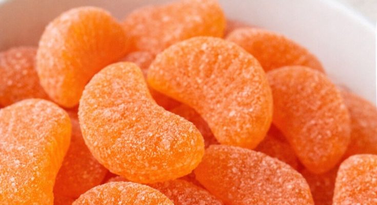 Orange slice candies are soft, sugar-coated jelly wedges flavored with citrus. Their chewy texture makes them ideal for reshaping.