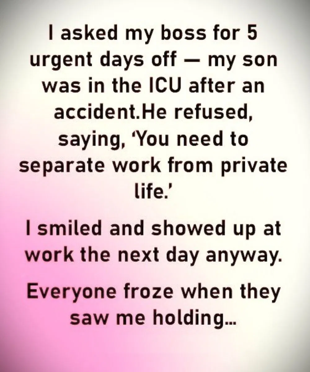Some mornings stay with you forever. The day I walked into the office holding a stack of neatly labeled folders, no one had any idea that I had spent the night in an ICU waiting room. My son had been rushed to the hospital after a sudden accident, and when I asked my boss for a few emergency days off, he refused. His only reminder was to “keep work and personal matters separate.”