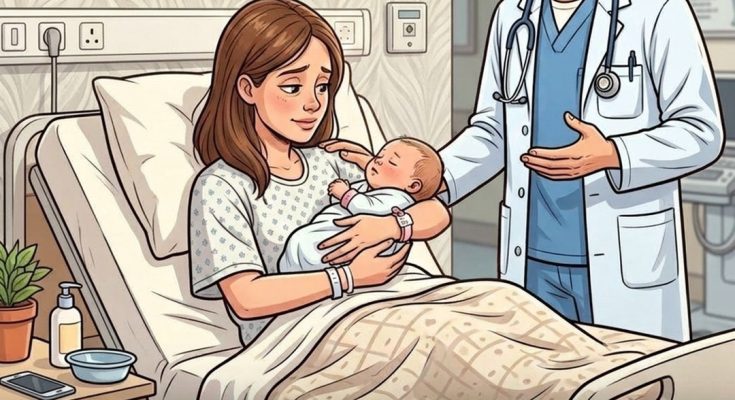 A new mother is sitting comfortably in her hospital bed while gently holding her newborn baby. The baby is wrapped in a soft blanket, and the mother appears relaxed as she admires her child. Standing nearby is a doctor who seems to be checking on both the mother and the baby after the delivery. The atmosphere in the room feels peaceful and routine, like a normal moment following the birth of a child.