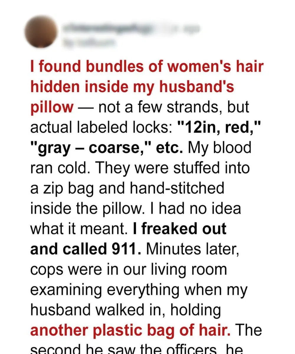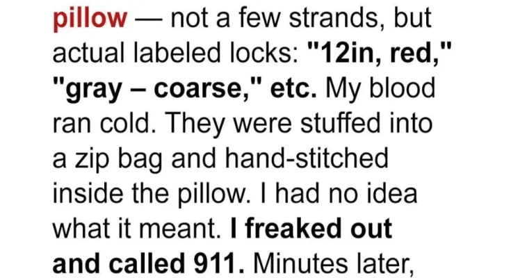 With trembling hands, I carefully opened the seam. Inside were several tiny plastic bags, each holding strands of hair labeled with names and dates. My heart stopped. What was this? I didn’t know whether to cry, panic, or call for help. Fearing the worst, I contacted the police before Travis returned home.