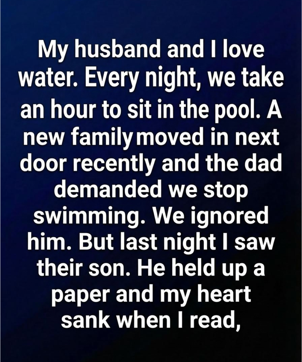 Then one evening, as we stood near the pool with towels around our shoulders, I noticed movement by the fence. I turned and saw their son—around twelve years old—standing silently on the other side. He didn’t climb over or call out. Instead, he carefully pressed a folded piece of paper between the wooden slats and waited.