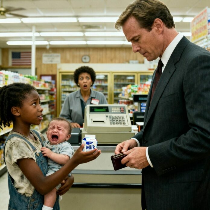 “Sir,” she whispered, clutching her brother closer. “My baby brother is hungry. Could you please give me a carton of milk? I’ll pay you back when I grow up.”
