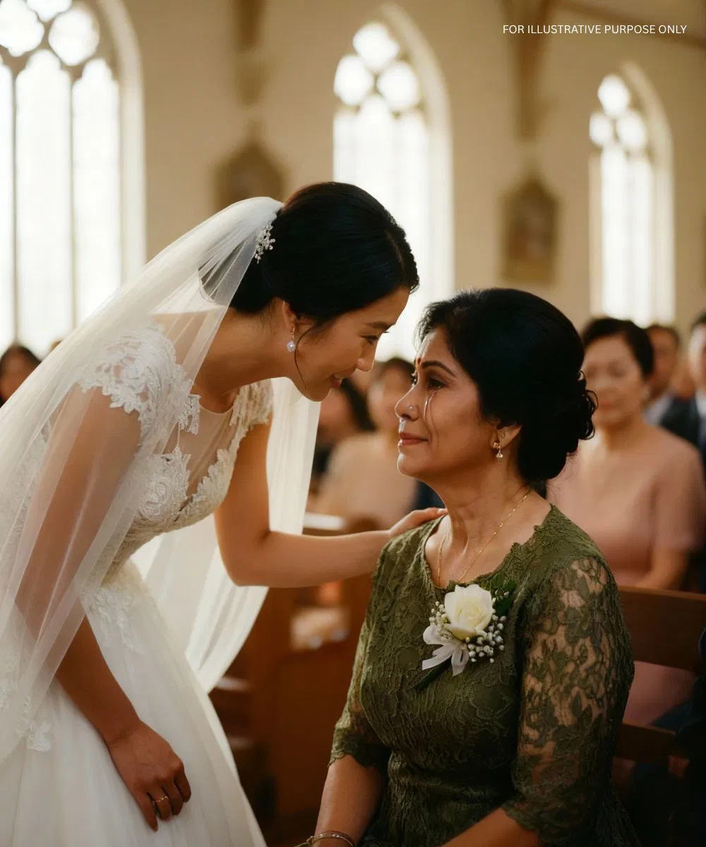 She looked radiant in her wedding gown, but her eyes were soft and warm. She gently held my hand, the hand that had carried baskets, cooked meals, and worked countless early mornings.