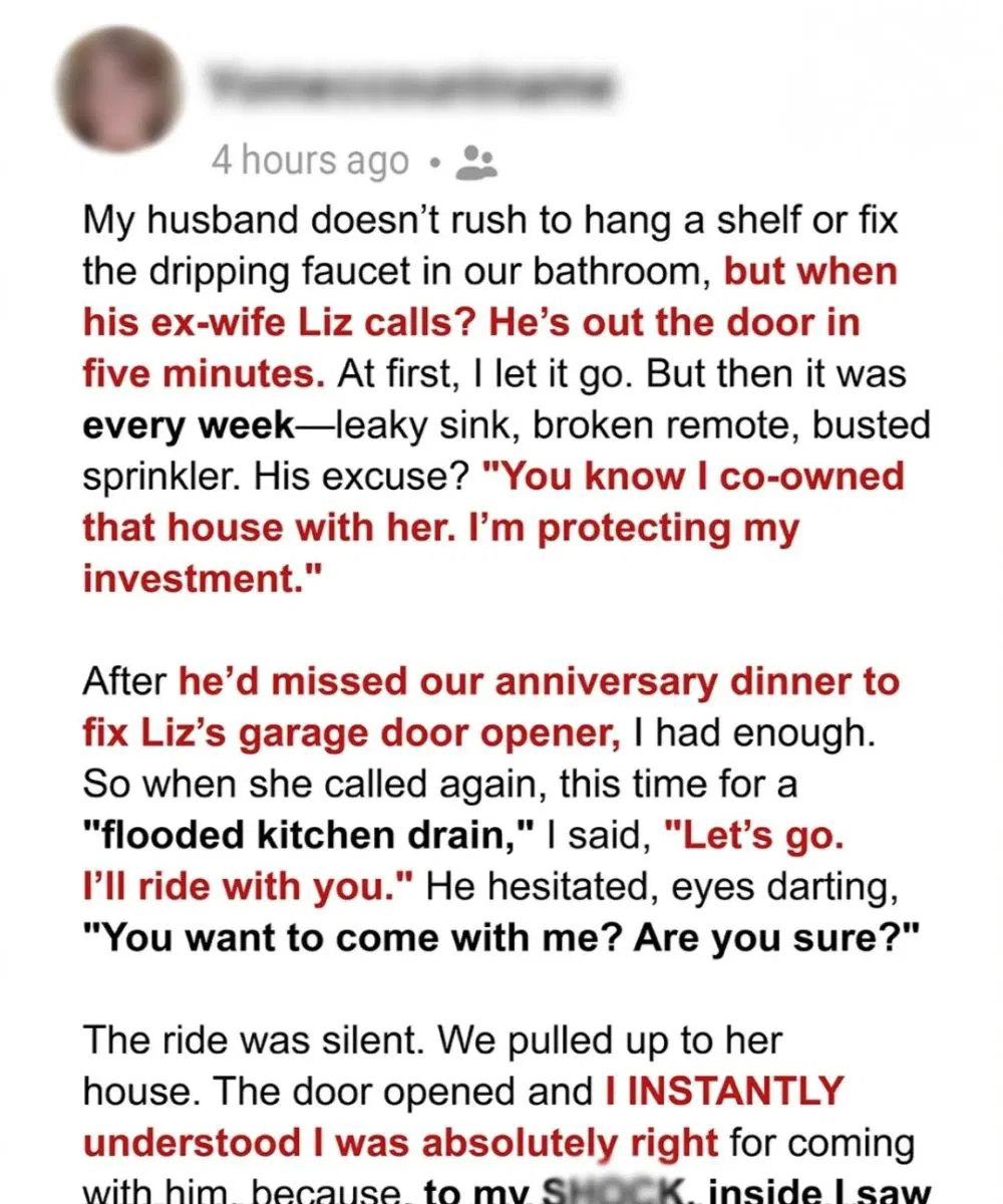 Every minor issue seemed to demand Henry’s attention. A loose doorknob, a leaky faucet, a flickering light—she always found a reason to call him. And while he hurried to fix her problems, the dripping faucet in our own kitchen became a quiet reminder of everything we’d been neglecting at home.