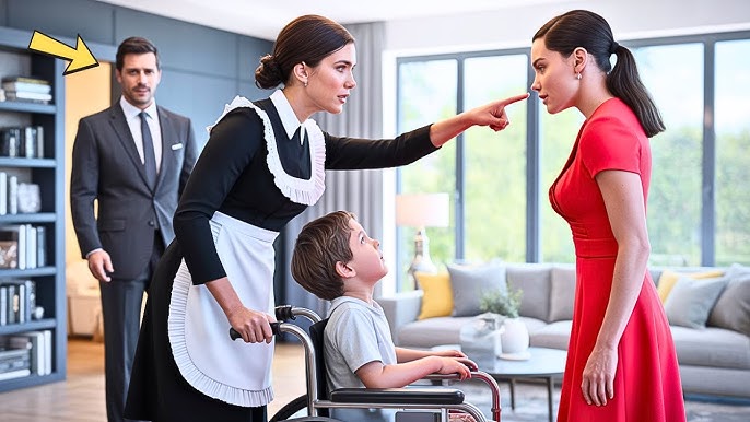 The 7-year-old boy in a wheelchair tried to hold back his tears, feeling lonely and overwhelmed. Just as a tense moment unfolded, the housemaid appeared and gently intervened, breaking the tension and offering a calming presence.