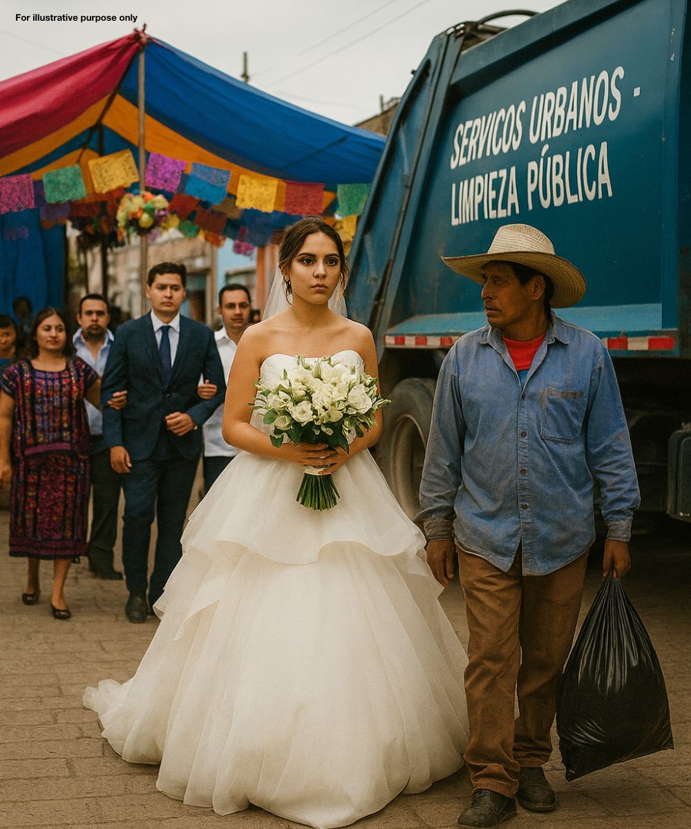 But before anyone could respond, the distant sound of an engine filled the street. A large garbage truck stopped right in front of the house. Gasps rippled through the guests as Don Manuel stepped out — calm, dignified, wearing his faded uniform.